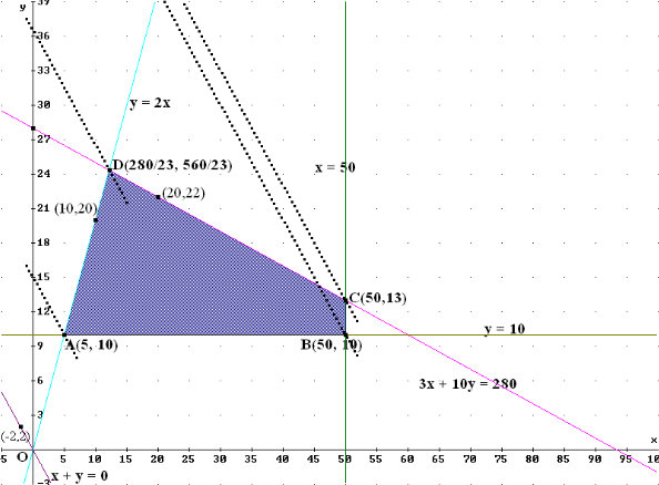 Las coordenadas de los vértices A, B, C, D se obtienen resolviendo el sistema de las dos rectas que pasan por cada vértice. El punto A(5, 10) es la solución del sistema {y = 2x e y = 10}, el punto C (50,13) resolviendo el sistema {3x +10y = 280 e x = 50} y el D(280/23, 560/23) el resultado del sistema {3x +10y = 280 e y = 2x}.